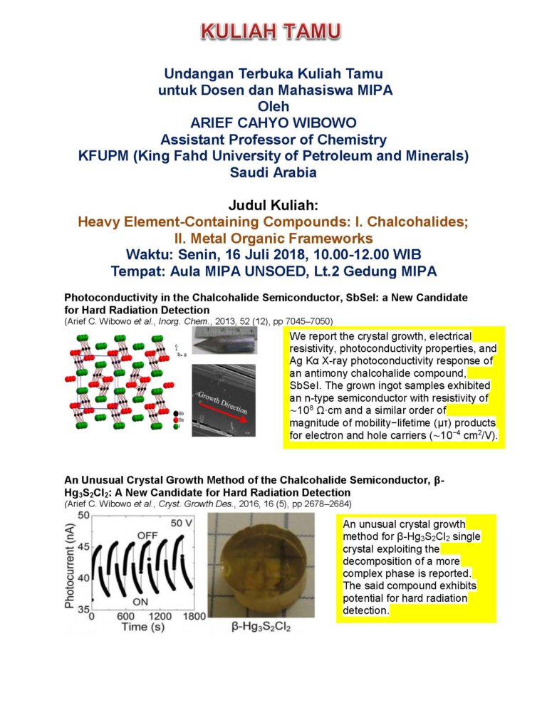 Jurusan Kimia FMIPA UNSOED Purwokerto akan menyelenggarakan Kuliah Tamu Bidang Kimia Anorganik atau Bidang yang Relefan.