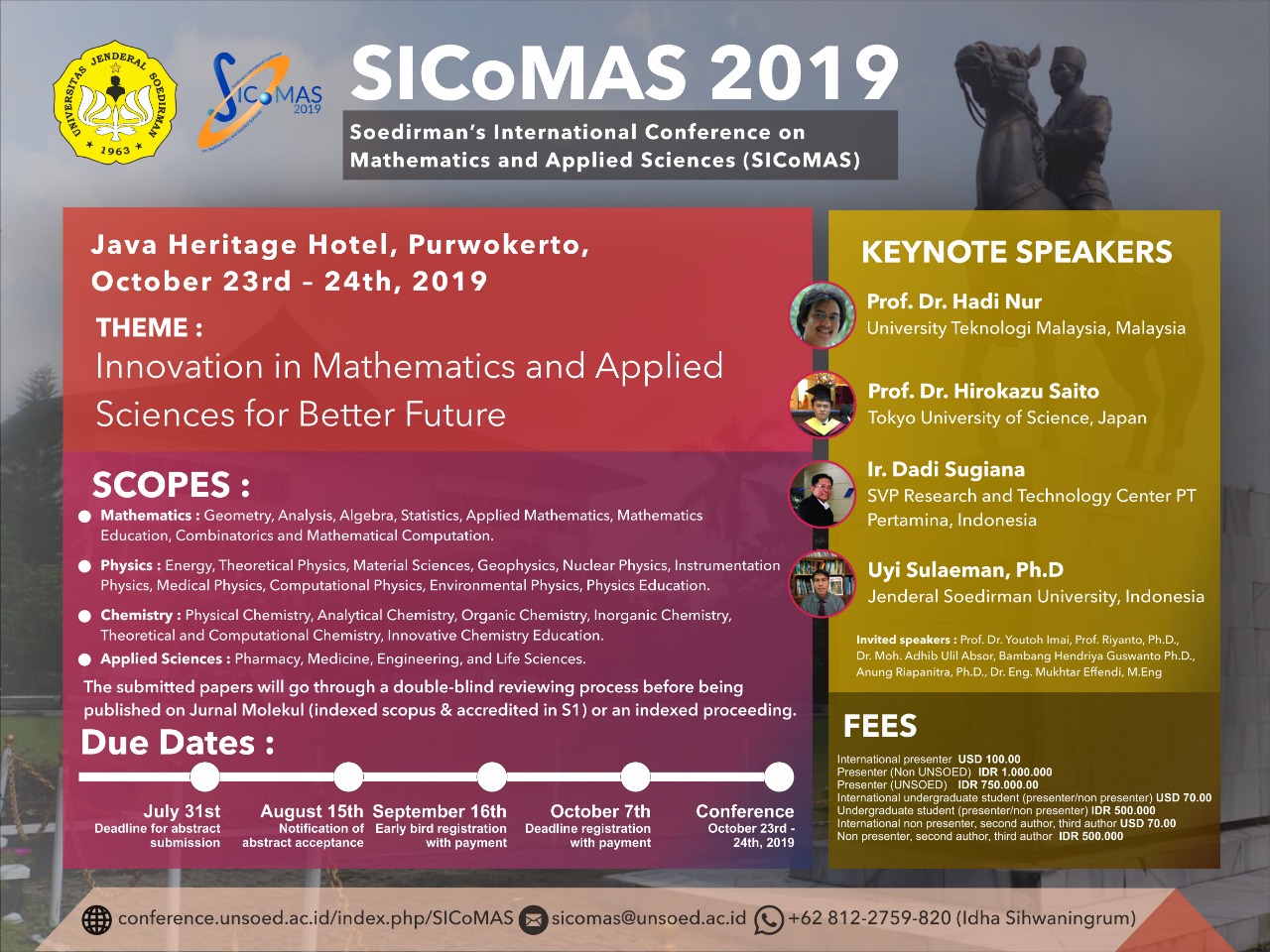 Soedirman’s International Conference on Mathematics and Applied Sciences (SICoMAS) 2019, yang rencana akan dilaksanakan selama 2 hari (23-24 Oktober, 2019 di Hotel Java Heritage, Purwokerto, Indonesia. Konferensi ini bertujuan untuk menyediakan platform bagi para peneliti, dosen, guru, mahasiswa, praktisi, dan profesional industri dari seluruh dunia untuk berbagi pengetahuan, bertukar gagasan, berkolaborasi, dan mempresentasikan hasil penelitian di bidang matematika, fisika, kimia, dan ilmu terapan.