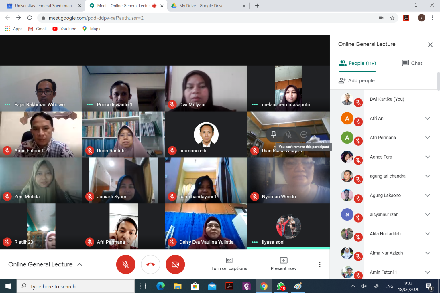 Purwokerto, 18 Juni 2020. Alhamdulillah Kuliah Umum Daring (Online General Lecture) yang diselenggarakan Jurusan Kimia berjalan lancar. Kuliah umum bertemakan ” Molecular Docking: Strategi dalam Penemuan Molekul Obat untuk COVID-19 ” diselenggarakan dengan aplikasi G-Meet. Kuliah umum dikesempatan ini menampilkan pembicara Dr.rer.nat. Fajar Rakhman Wibowo dari Departemen Kimia FMIPA, Universitas Sebelas Maret, Surakarta, Indonesia. Acara ini di moderatori oleh Dr. Ponco Iswanto. Acara berlangsung dengan tertib dihadiri sekitar 165 partisipan dari berbagai kalangan Dosen, peneliti, perusahaan, guru, mahasiswa, PLP dari Jawa dan Luar Jawa.