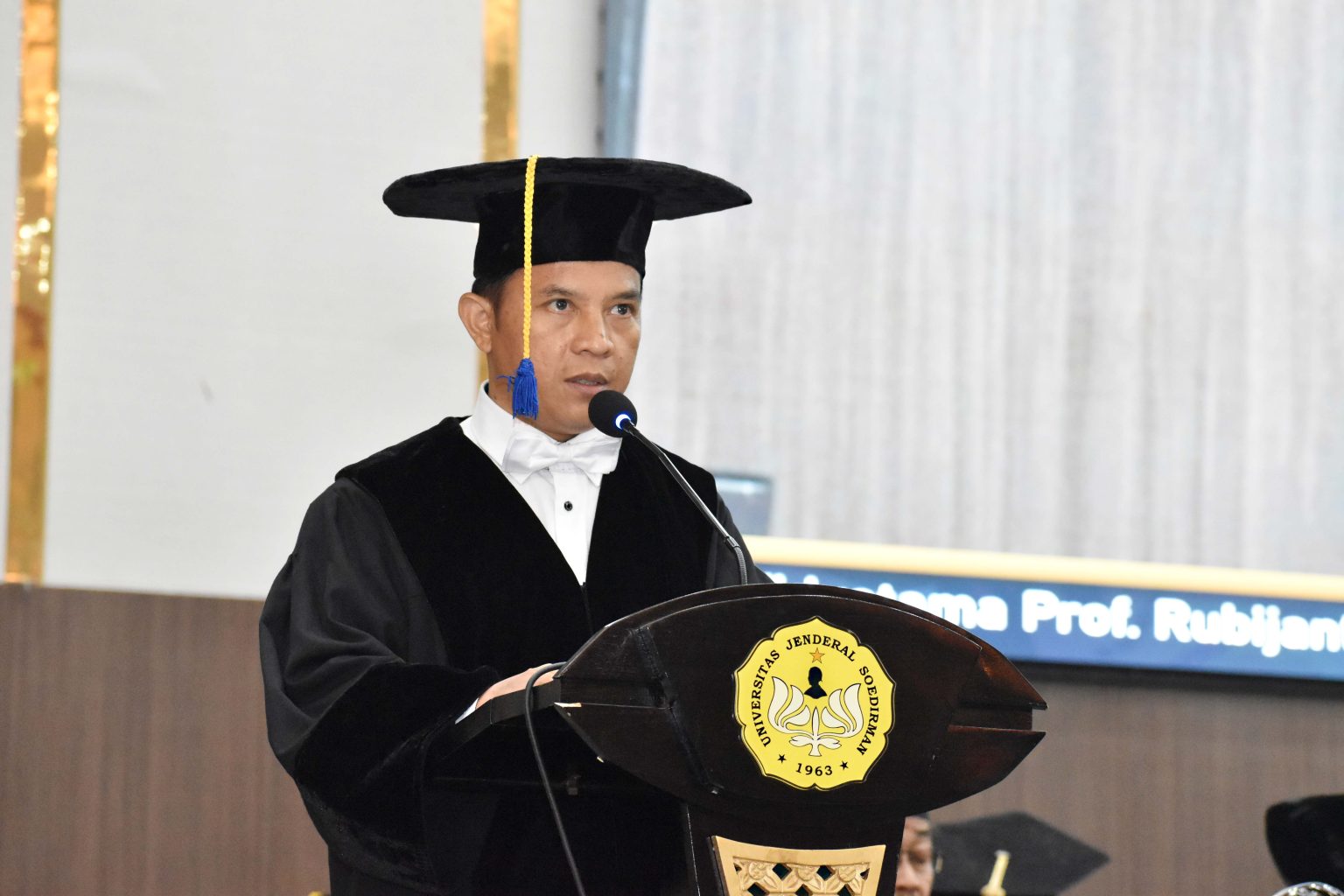 Rektor Unsoed Prof.Dr.Ir Akhmad Sodiq M.Sc., Agr., IPU dalam sambutannya menyampaikan, sebagai Guru Besar dalam Ilmu Biosensor, pemikiran Prof Amin Fatoni telah menunjukkan kekayaan ide dan gagasan untuk inovasi yang memiliki nilai fungsi strategis, sekaligus berorientasi untuk menjaga lingkungan hidup dari potensi yang meresikokan generasi masa depan.